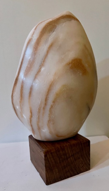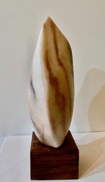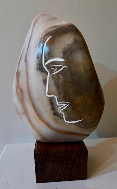 J’avais depuis longtemps ce petit bloc en marbre blanc rayé ocre. Très beau tellement beau qu’après avoir travaillé cette forme je ne pouvais la tailler donc une gravure sur ce petit format… pas facile mais j’aime le résultat : un profil masculin ou féminin ou les deux ?